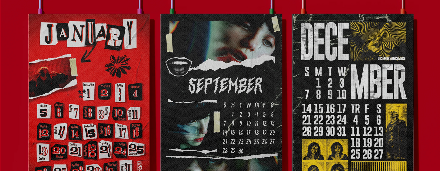 The theme for the calendar was inspired by my love for the punk aesthetic and its bold, eye-catching visuals. I’ve always been drawn to the raw energy and unique style that comes with that look, so I wanted to capture that throughout the project. Most of the graphics were either edited or created from scratch to fit the theme and keep everything visually consistent. Starting with a few pre-planned designs helped me find my rhythm and made it easier to come up with fresh ideas for the rest of the spreads. This approach kept the overall style cohesive while still letting each month’s design have its own personality.